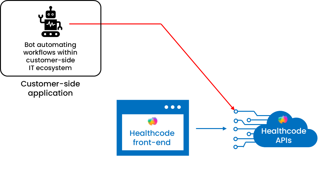 If your organisation uses robotic process automation (RPA), whether on backend servers or through front-end automation, these bots can also connect to Healthcode systems. We recommend following the standard API integration process described earlier.